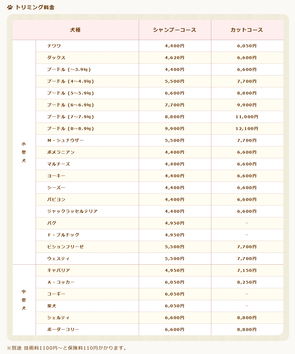 | 小型犬 | 4,400円~ | 6,050円~ |
